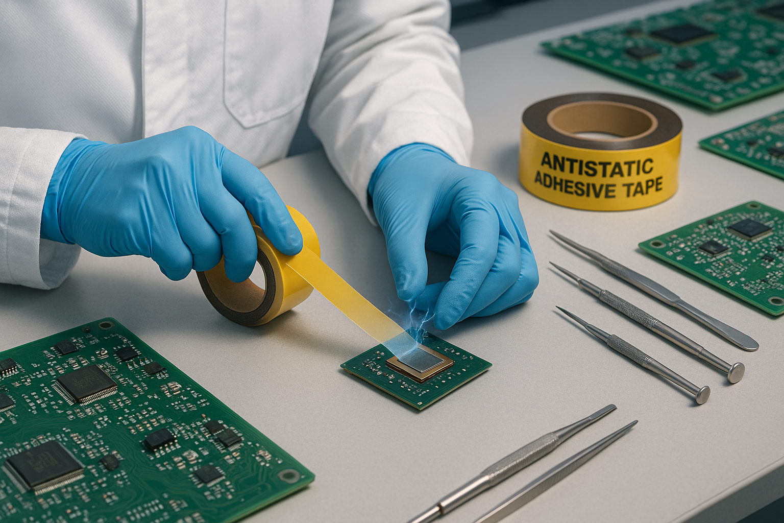 Сборка печатных плат (PCB) и работа с полупроводниковыми компонентами являются одними из наиболее приоритетных случаев использования антистатических лент. При операциях захвата и размещения устройства подачи ленты и ленты-носители, накапливающие заряд, могут привести к неправильной подаче или притягиванию загрязнений; при пайке оплавлением и волновой пайкой заряженные частицы могут вызвать дефекты припоя. Использование лент с контролируемым поверхностным сопротивлением помогает поддерживать технологические окна с защитой от электростатического разряда и сводит к минимуму сбои сборки, вызванные электростатическими явлениями.