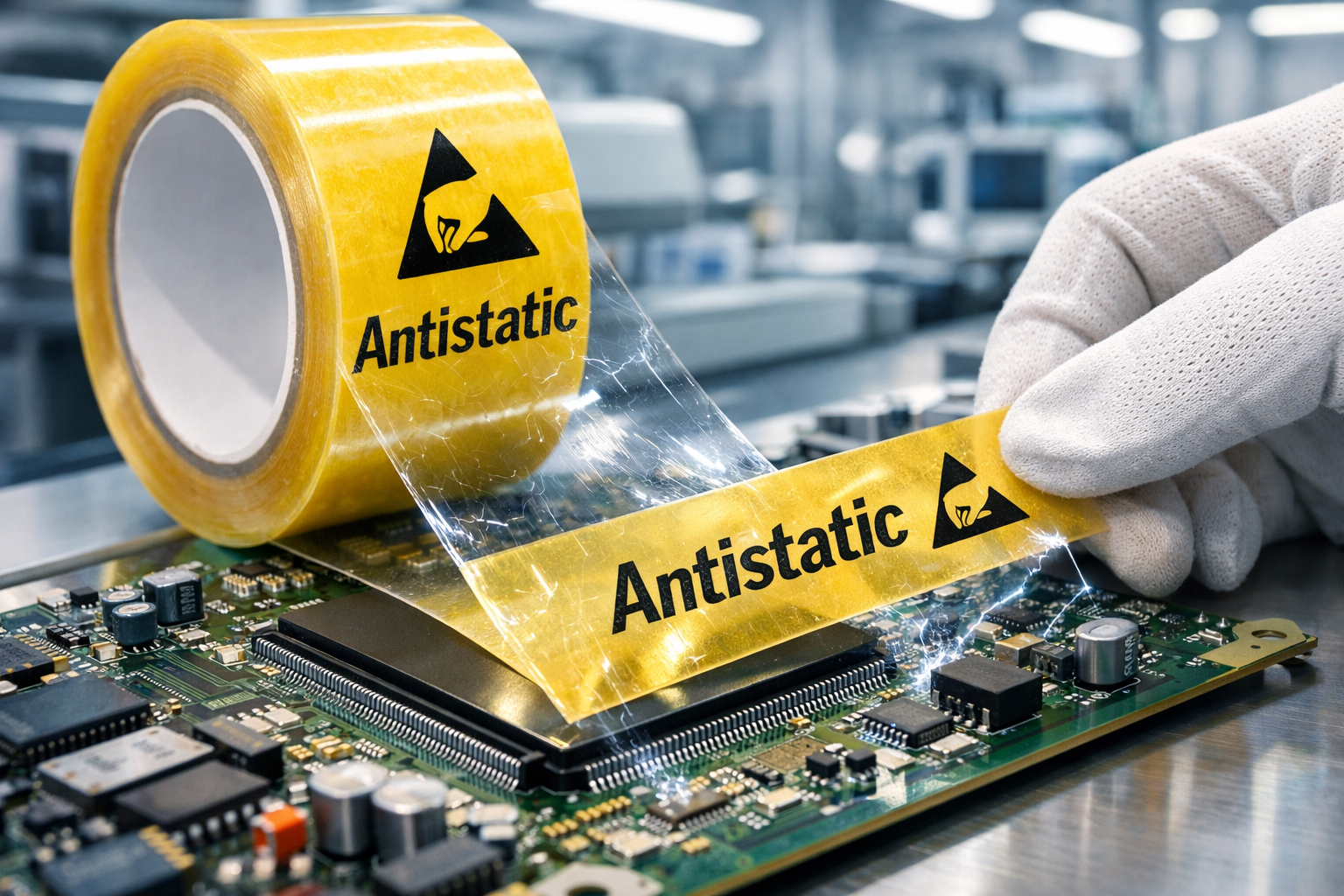 Антистатики в клейких лентах выполняют множество функций, которые напрямую приносят пользу производству электроники. Они уменьшают накопление статического электричества во время процессов обработки, сборки и упаковки. Это имеет решающее значение для предотвращения электростатического разряда (ESD), который может повредить микрочипы, печатные платы и другие чувствительные электронные детали.